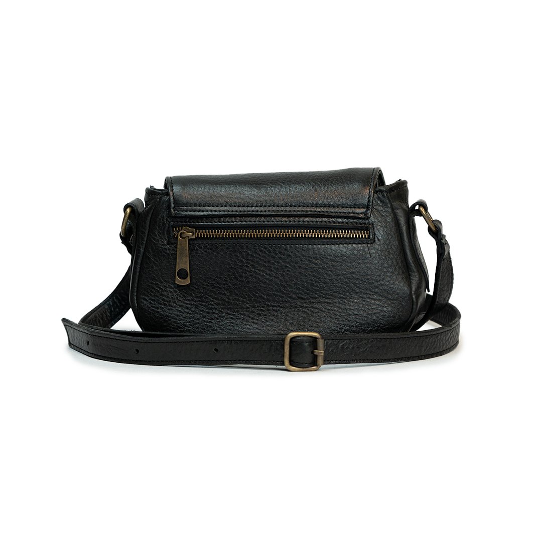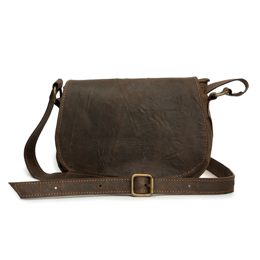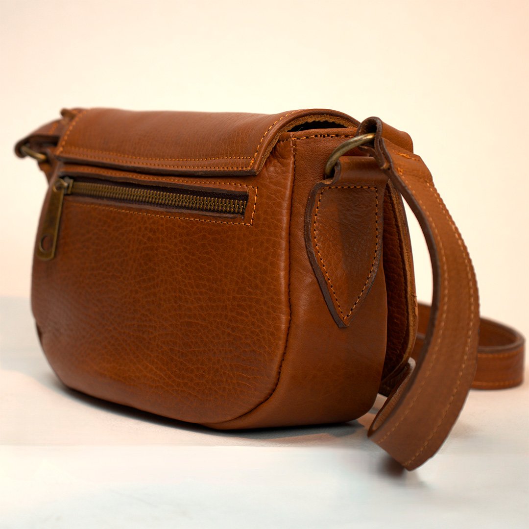 Bandolera Mini Sevilla. Confeccionada en cuero vacuno con correa regulable. Cuenta con interior forrado en tela gross, bolsillo interno y bolsillo trasero, ambos con cierre color bronce.