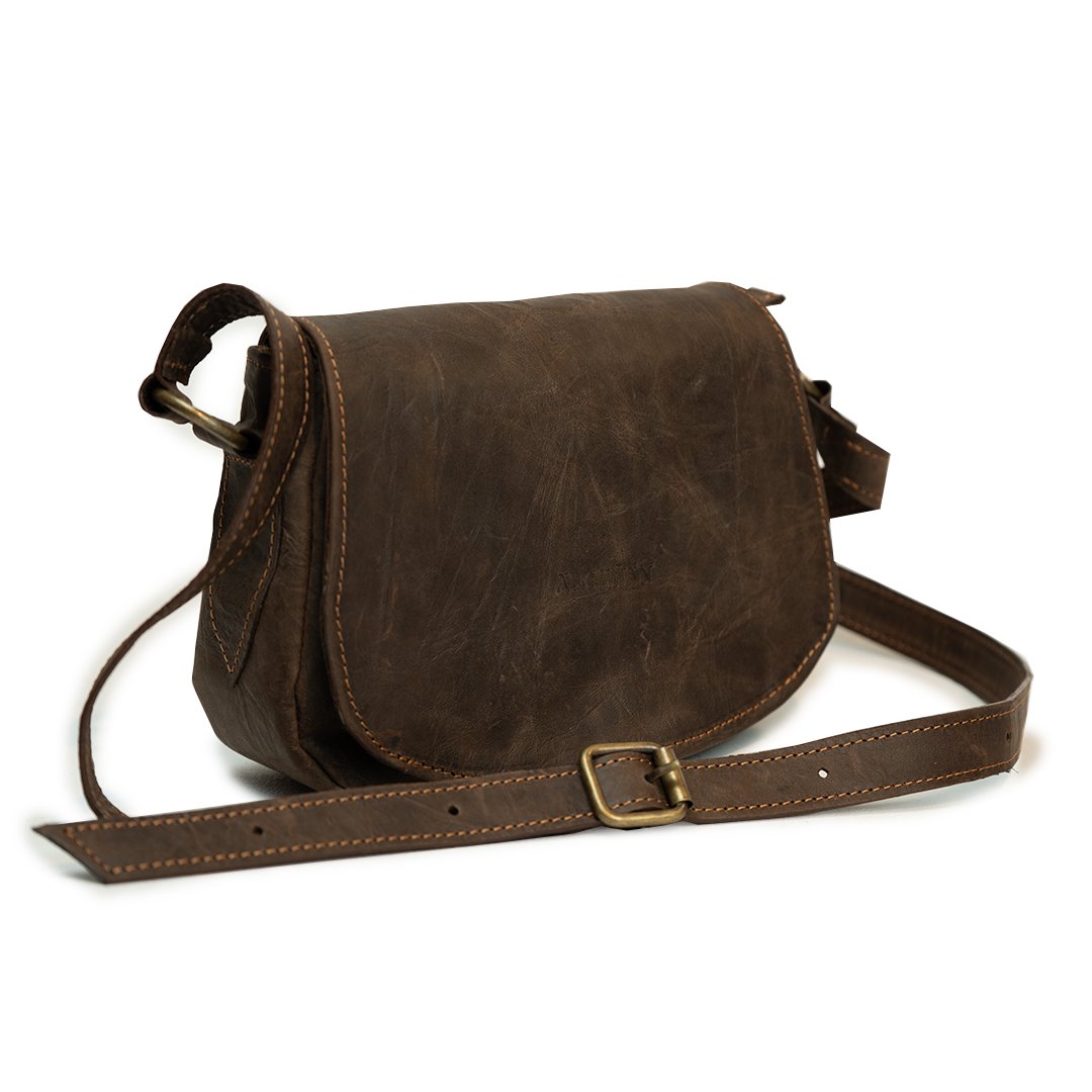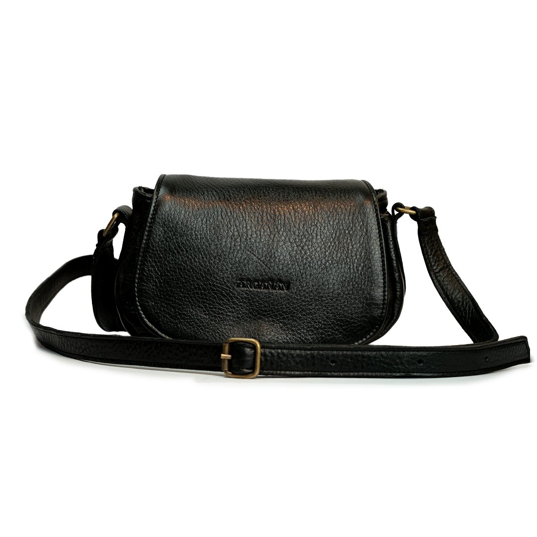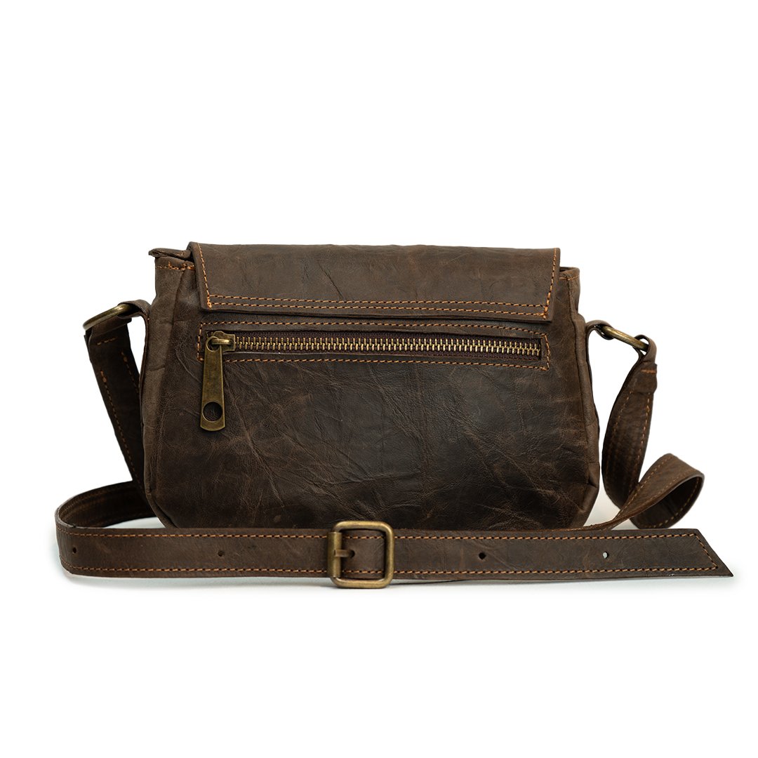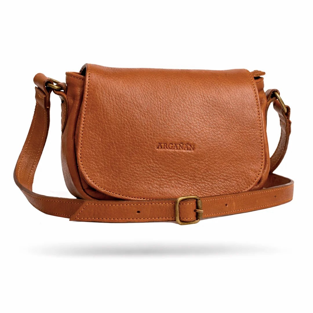 Bandolera Mini Sevilla. Confeccionada en cuero vacuno con correa regulable. Cuenta con interior forrado en tela gross, bolsillo interno y bolsillo trasero, ambos con cierre color bronce.