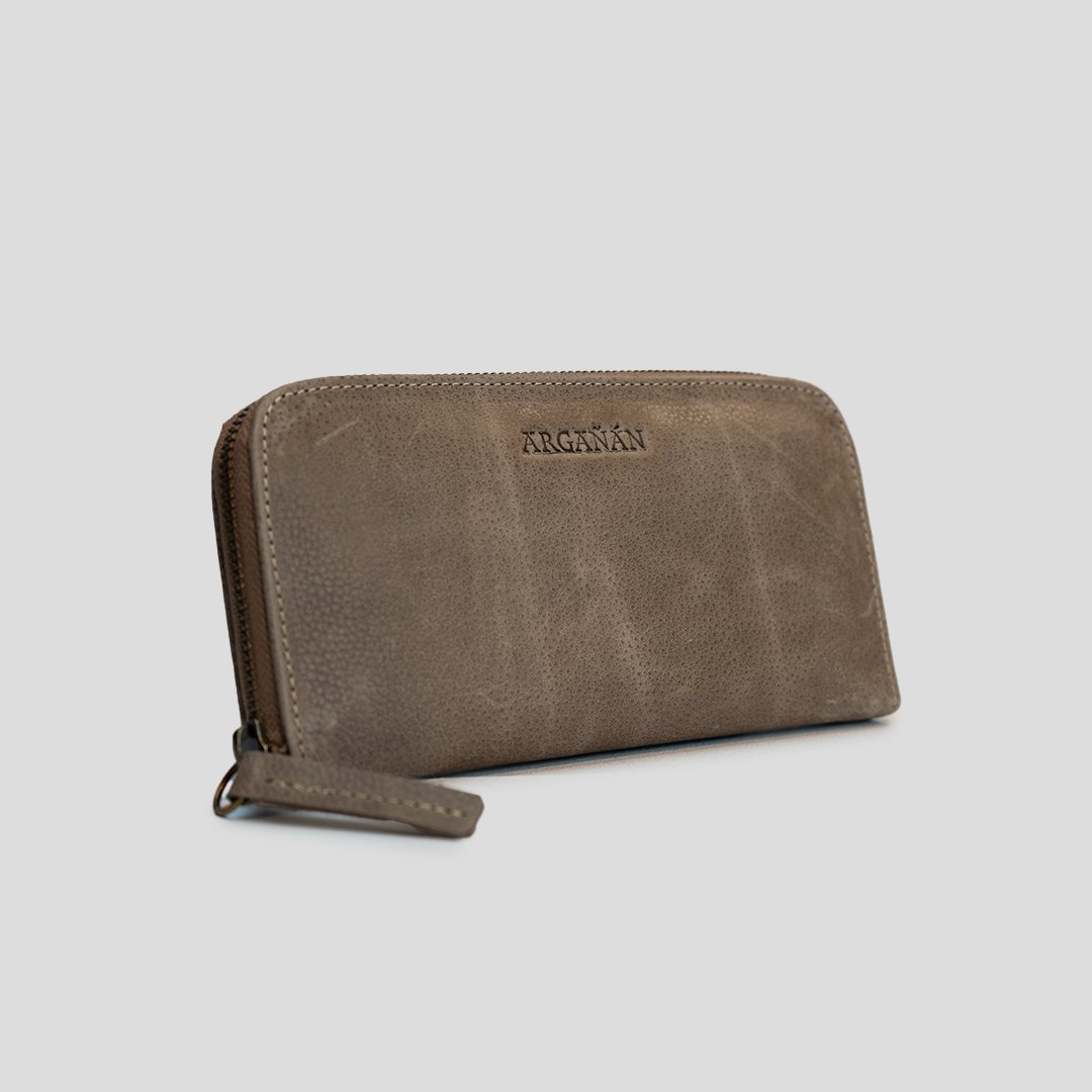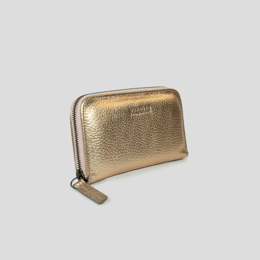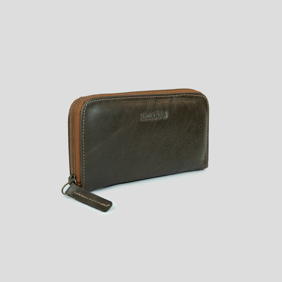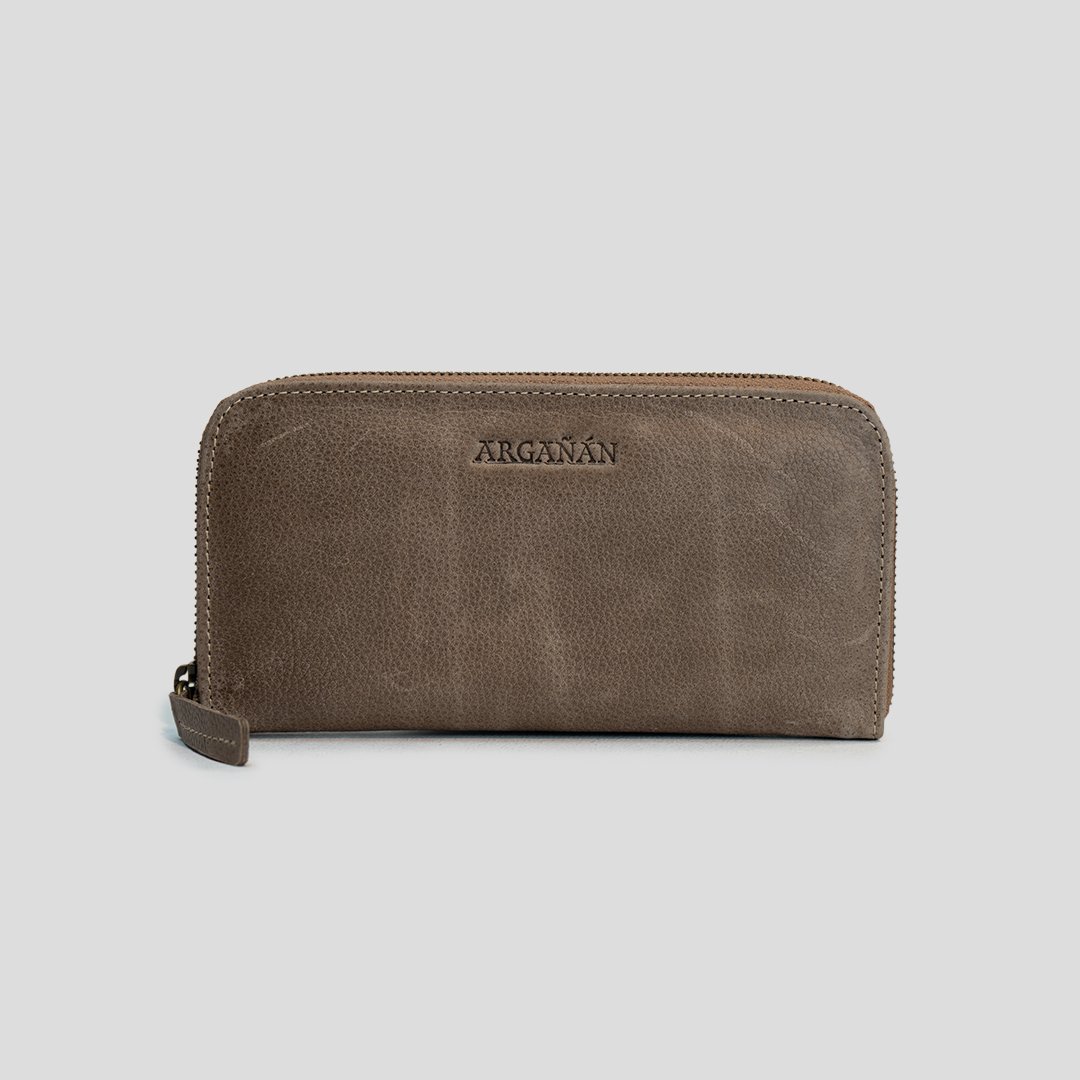 Billetera Trevelin, confeccionada en cuero vacuno. Tiene apertura mediante cierre de color bronce.