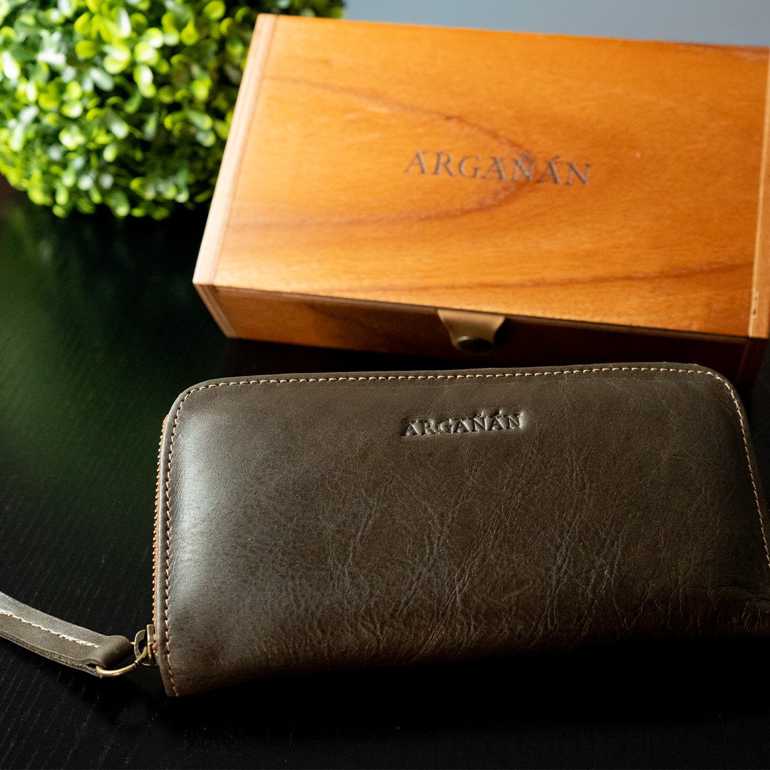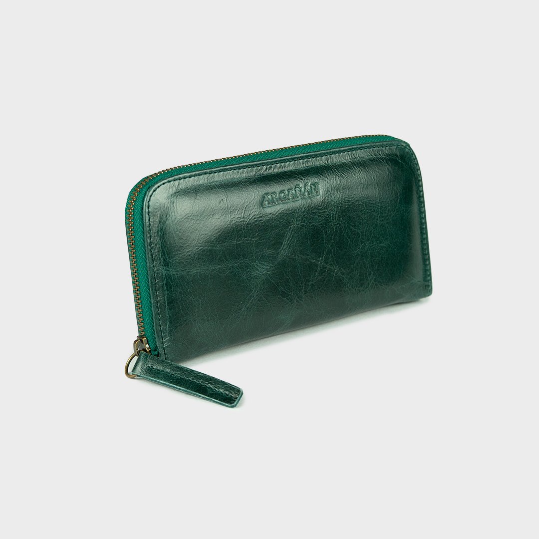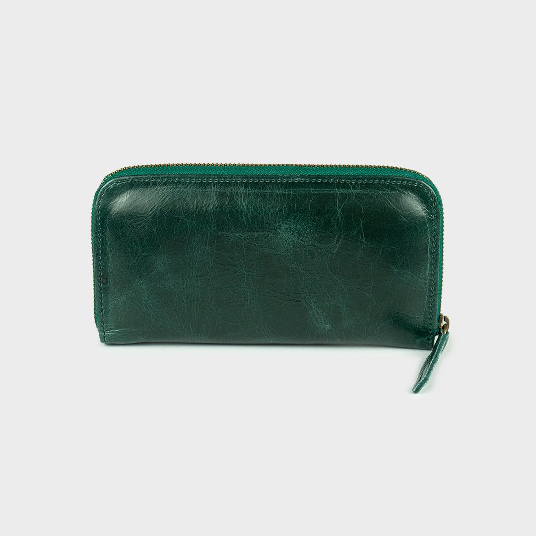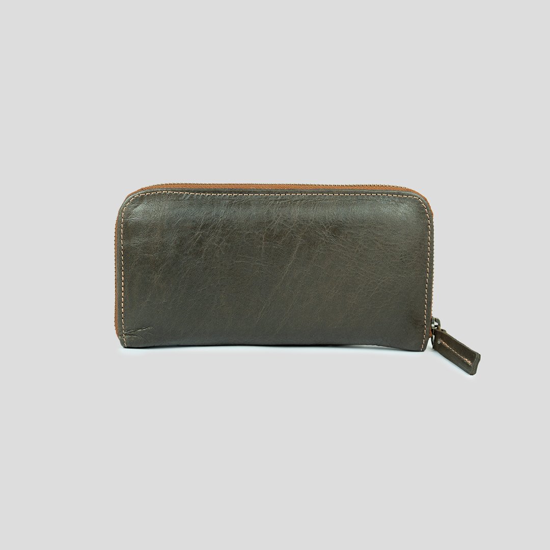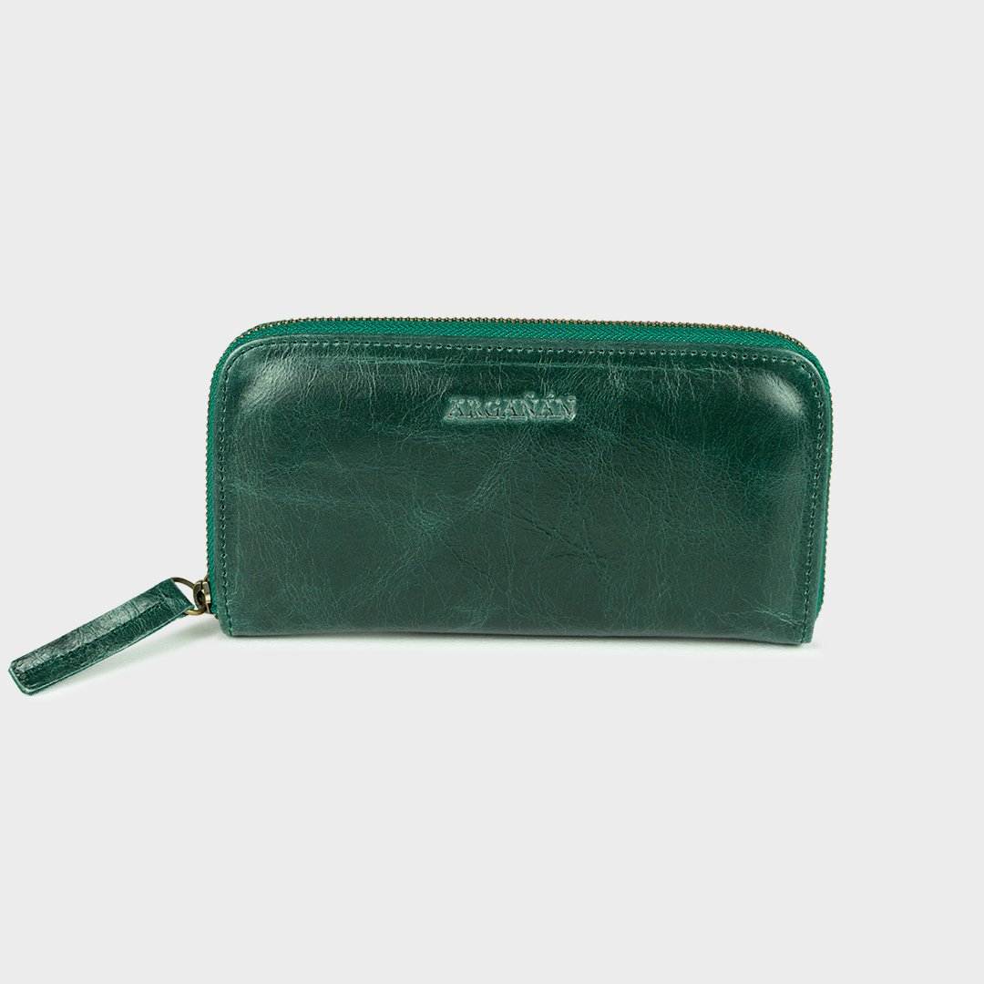 Billetera Trevelin, confeccionada en cuero vacuno. Tiene apertura mediante cierre de color bronce.