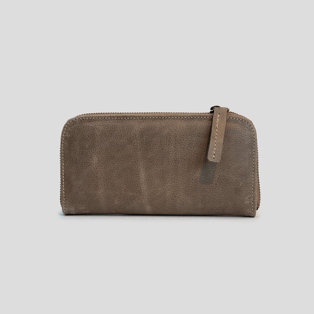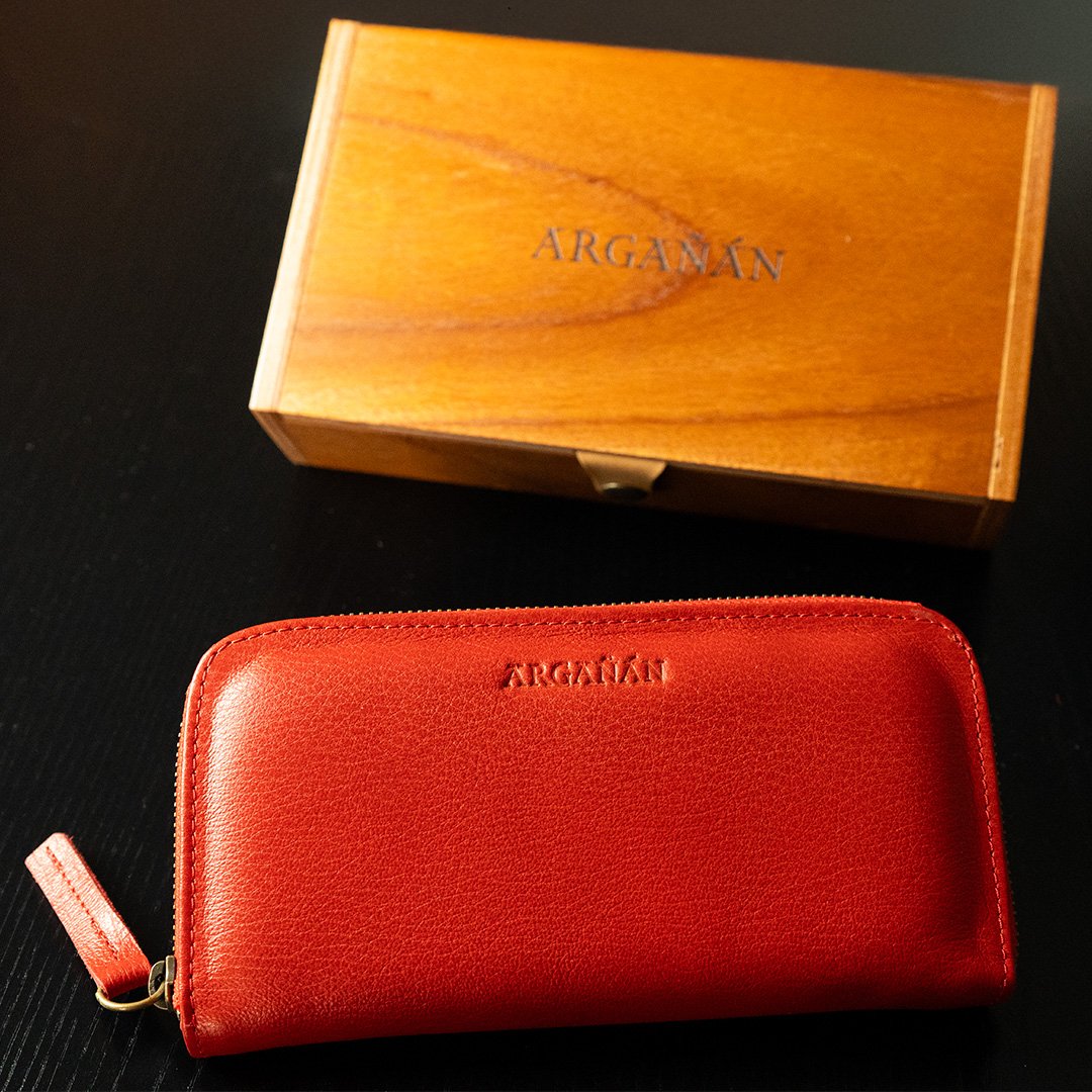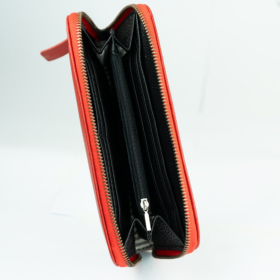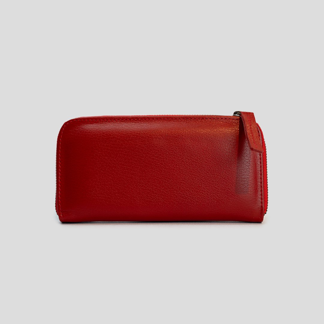 Billetera Trevelin, confeccionada en cuero vacuno. Tiene apertura mediante cierre de color bronce.