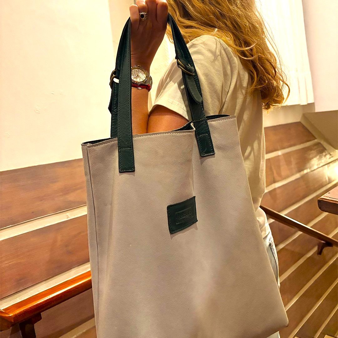 Tote Bag Pertutto Advantage, confeccionada en gamuza cuero vacuno, combina colores Marfil con Verde Inglés. Con manijas regulables, que la convierten en el accesorio perfecto para llevar todo lo que necesitás con comodidad y estilo en tu dia a dia.
