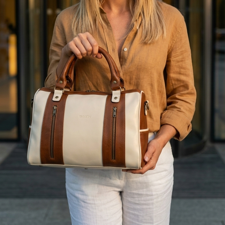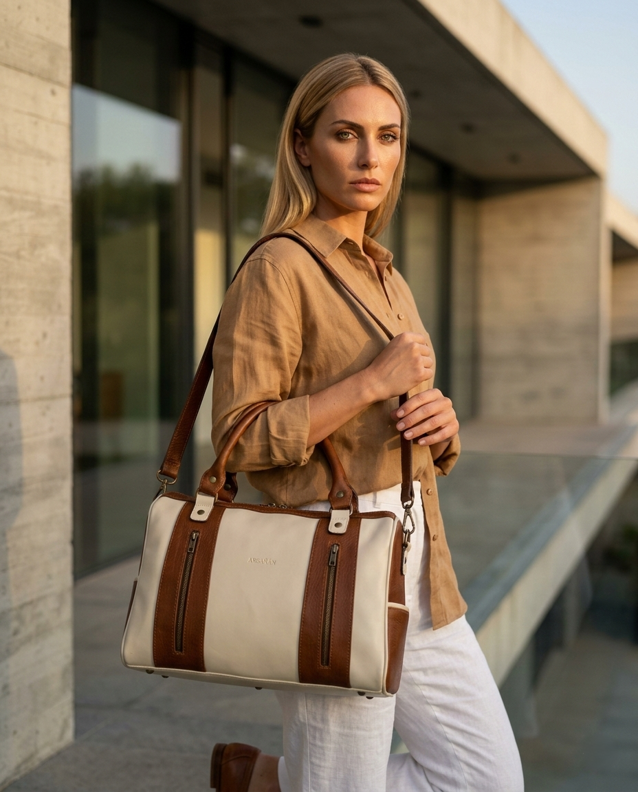 El Bolso Salamanca confeccionado 100% en cuero vacuno de colores neutros y cálidos, cuenta con un amplio interior forrado en tela gross de algodón, e incluye un bolsillo interno con cierre y otro bolsillo interno abierto. Gracias a sus asas cortas y correa ajustable y desmontable, aportan versatilidad y elegancia a tu estilo.