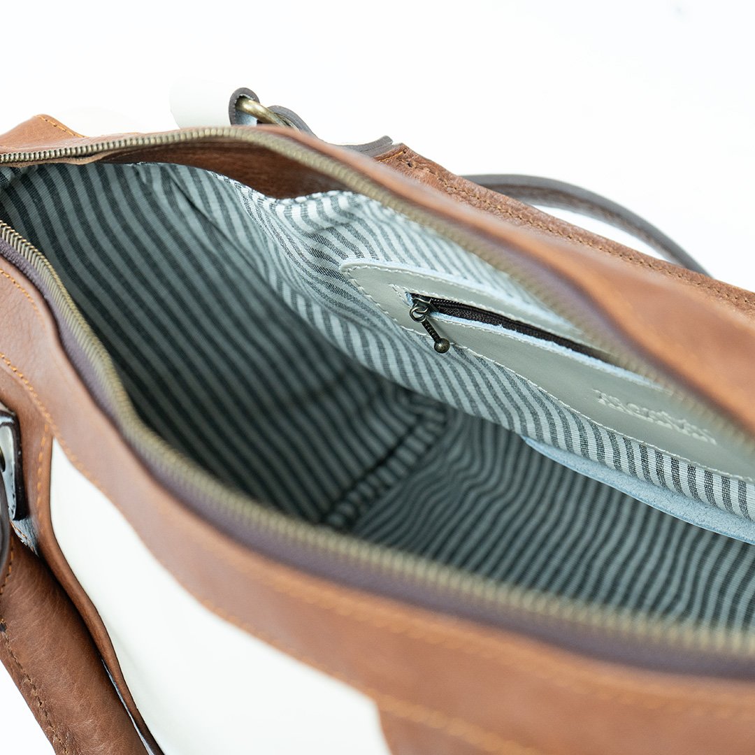 El Bolso Salamanca confeccionado 100% en cuero vacuno de colores neutros y cálidos, cuenta con un amplio interior forrado en tela gross de algodón, e incluye un bolsillo interno con cierre y otro bolsillo interno abierto. Gracias a sus asas cortas y correa ajustable y desmontable, aportan versatilidad y elegancia a tu estilo.