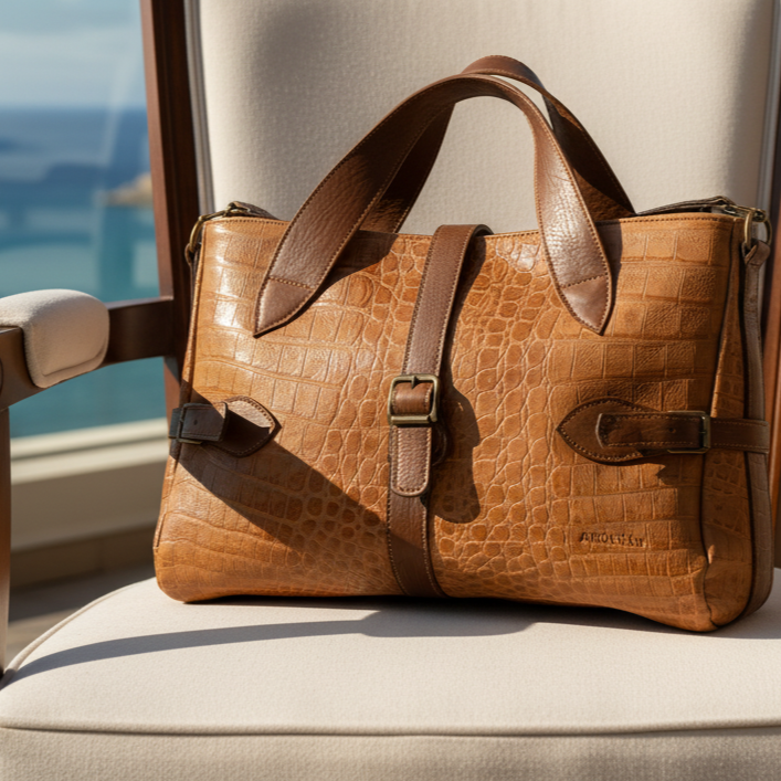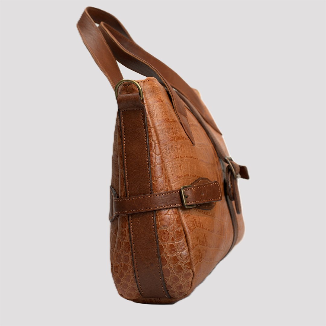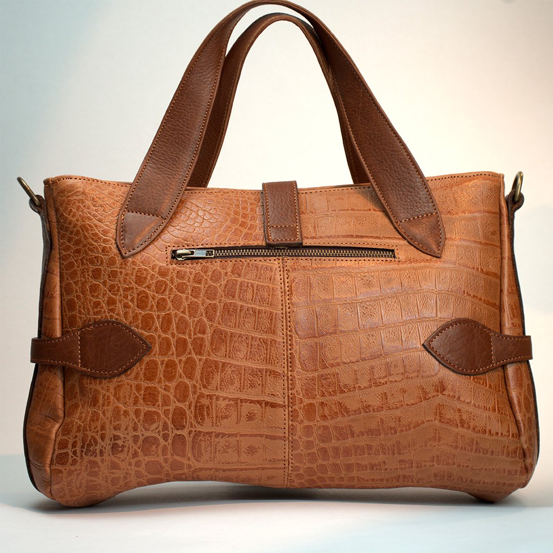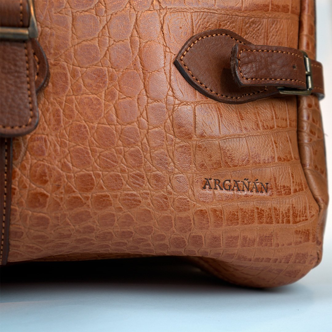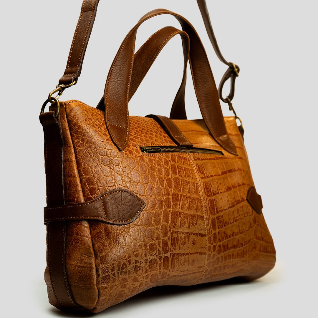 Cartera Benidorm de cuero vacuno en color suela combinado croco, cuenta con herrajes color bronce y correa regulable desmontable para adaptarla a tu estilo.