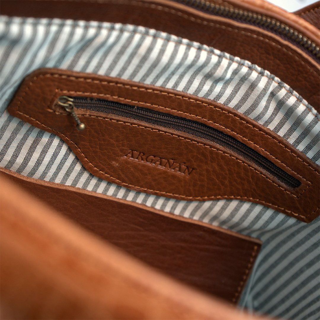 La cartera Benidorm tiene apertura superior con broche imantado y cierre YKK color bronce. Cuenta con un interior forrado en tela gross de algodón, bolsillo interno con cierre y bolsillo abierto más un compartimento interno que te permiten llevar todo organizado.