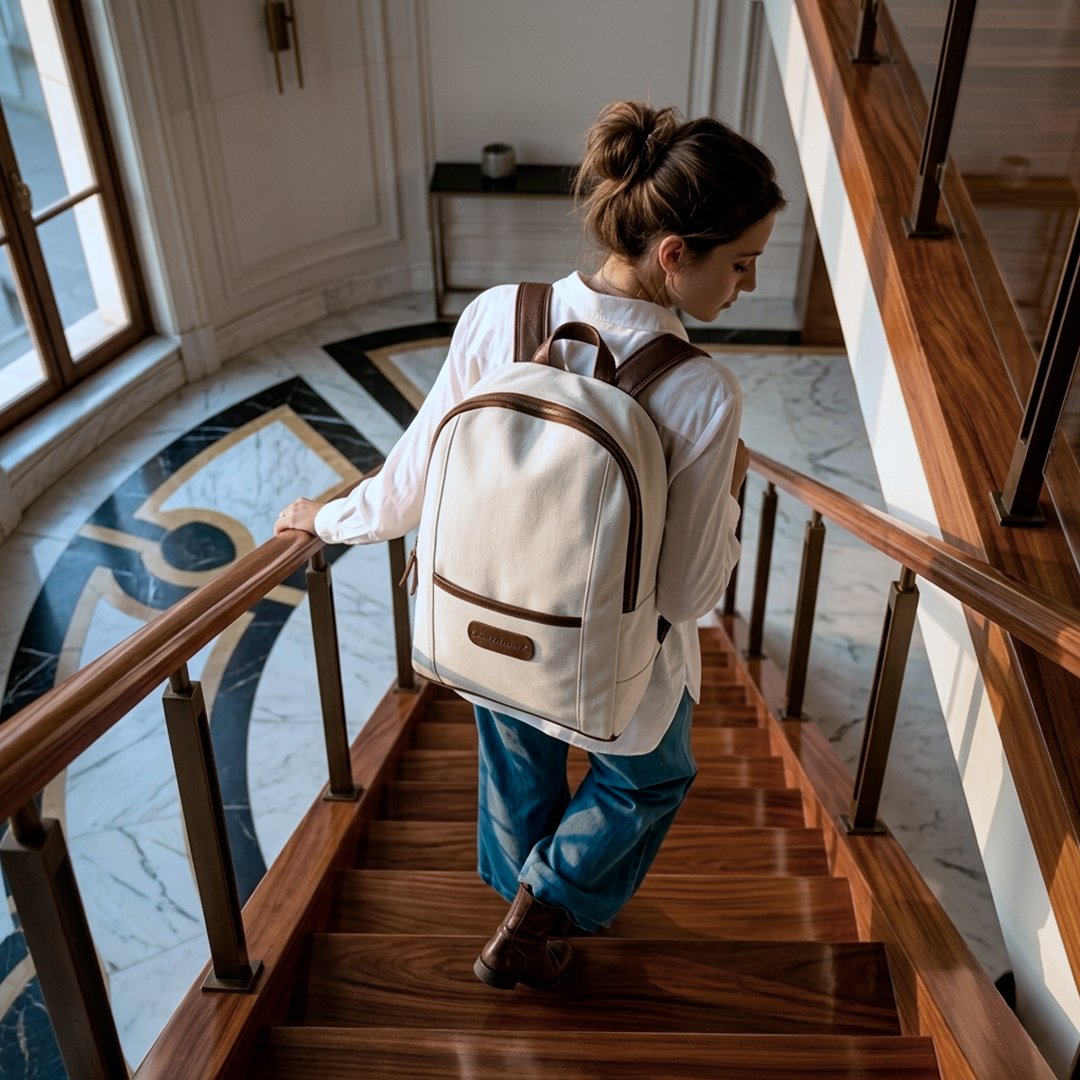 Mochila Mediteránea confeccionada en lona algodón, combina con correas, y detalles de cuero vacuno de color avellana, cuenta con bolsillo interno y externo, y cierres metálicos YKK, que la convierten en la opción versátil que se adapta a vos.