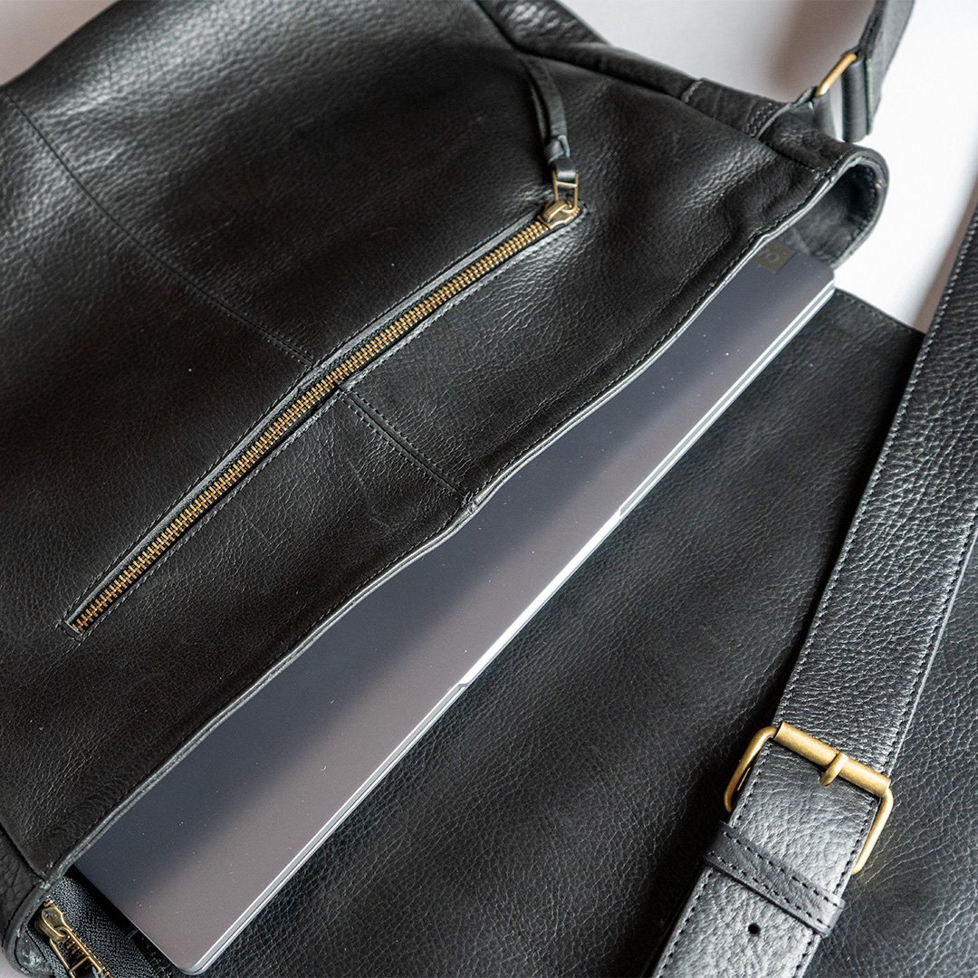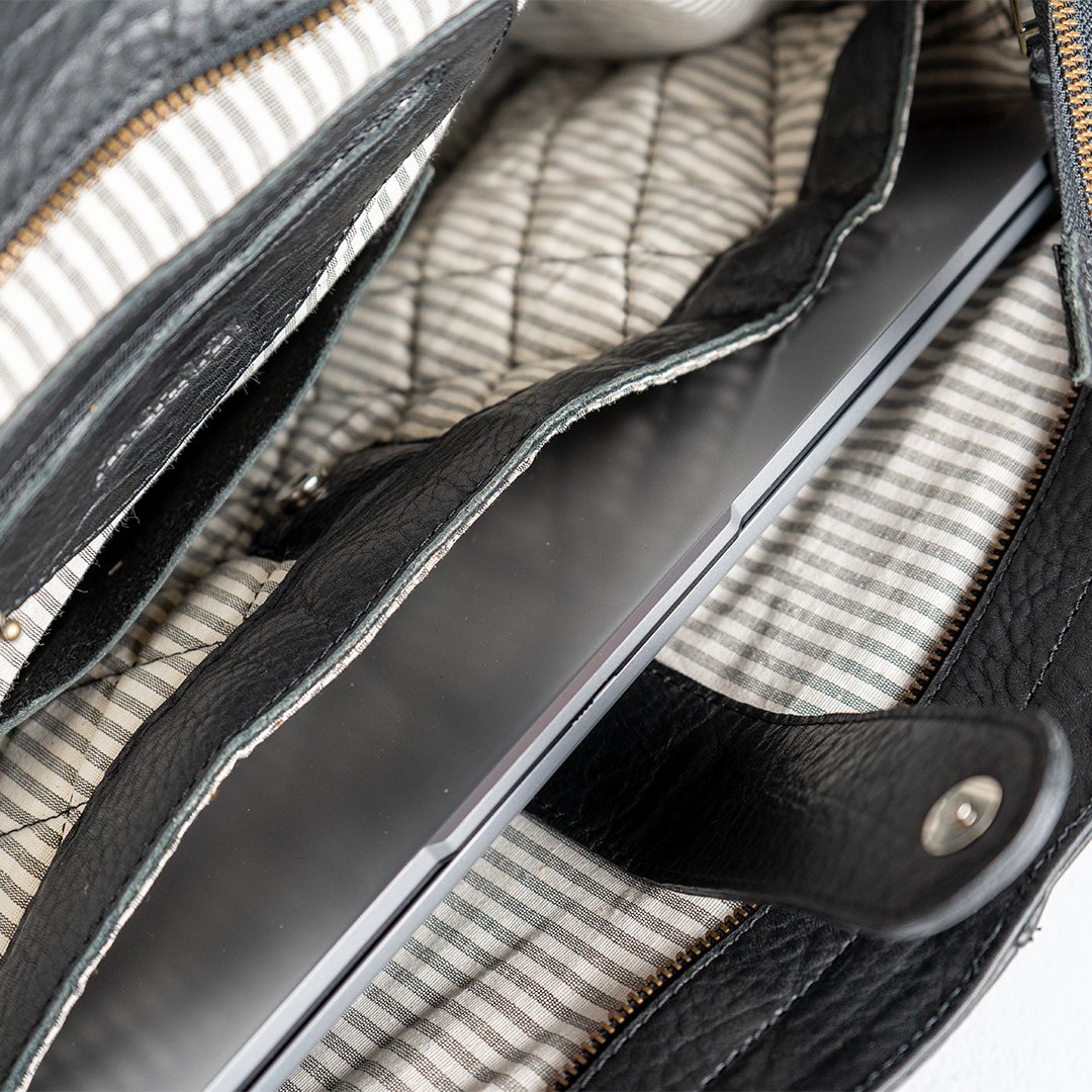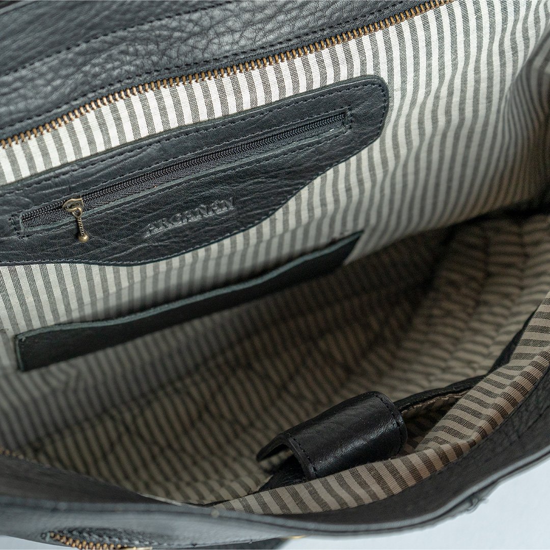 Su amplio interior está forrado con tela gross de algodón, y tiene un compartimento acolchado grande para notebook con broche y detalles de cuero vacuno, más un bolsillo interno con cierre y otro bolsillo interno abierto para guardar tus objetos más pequeños.
