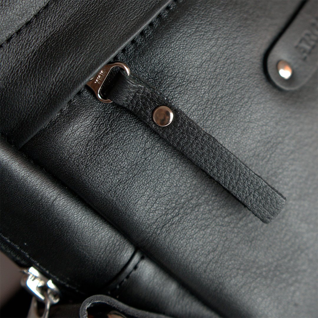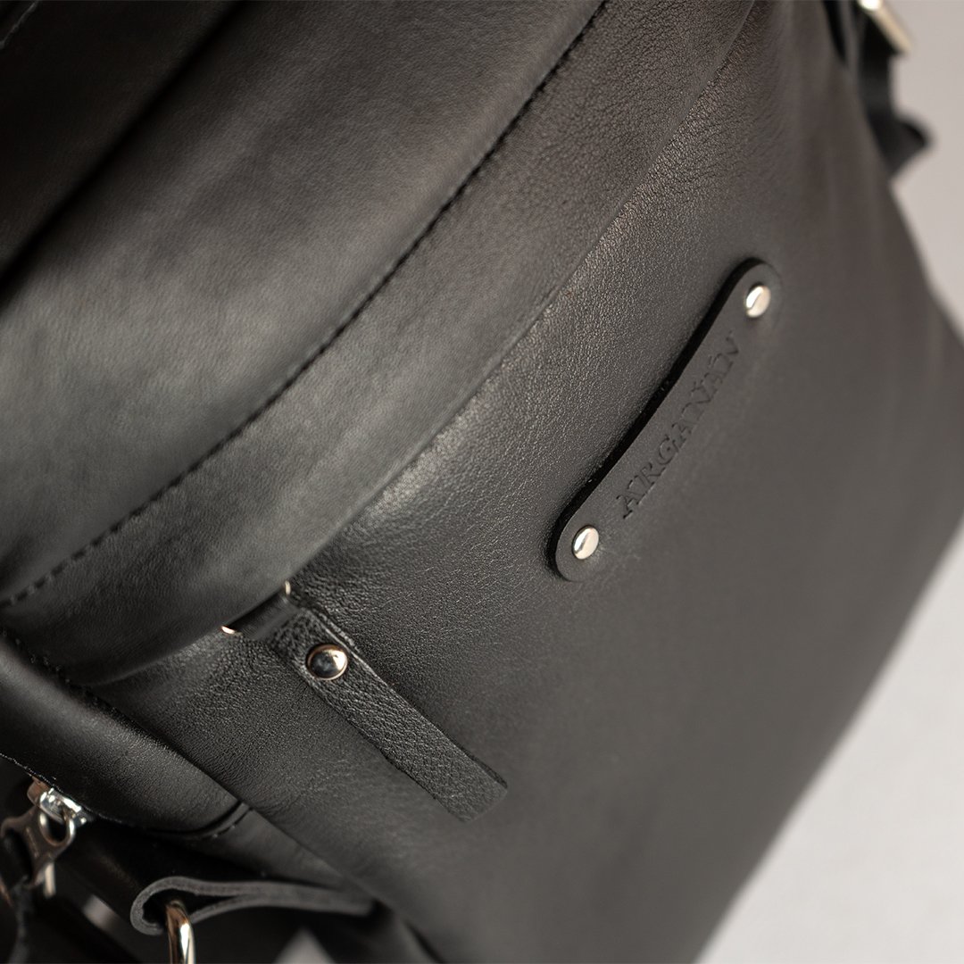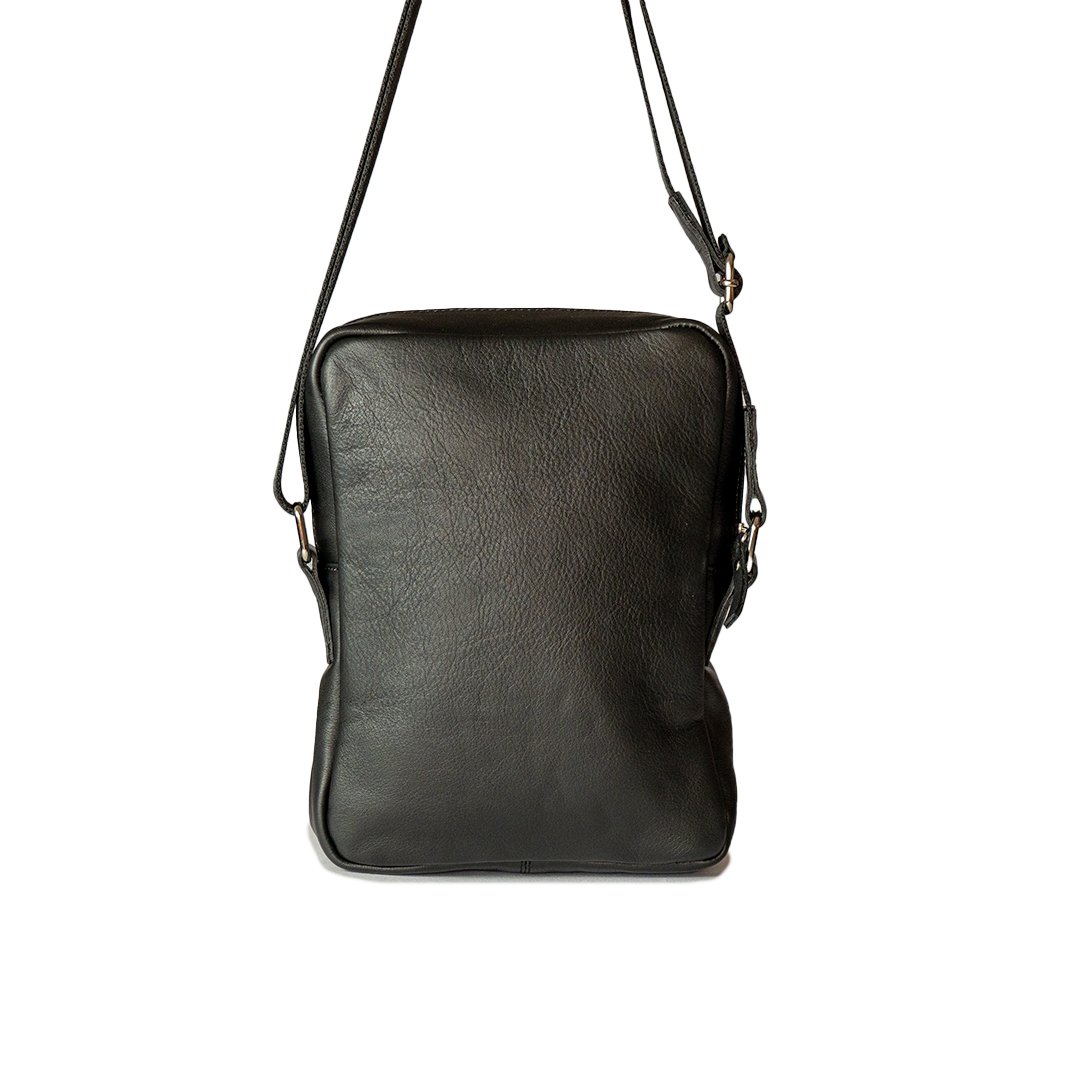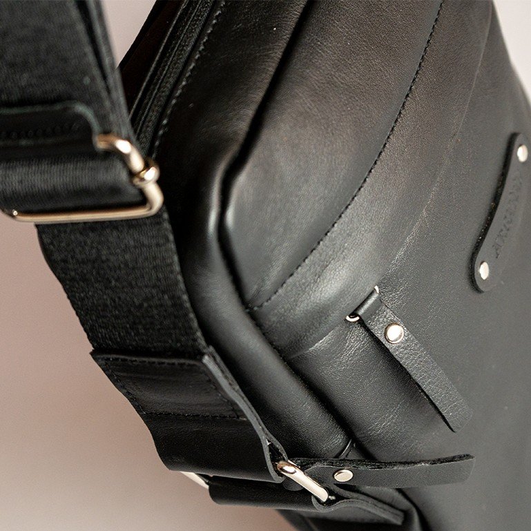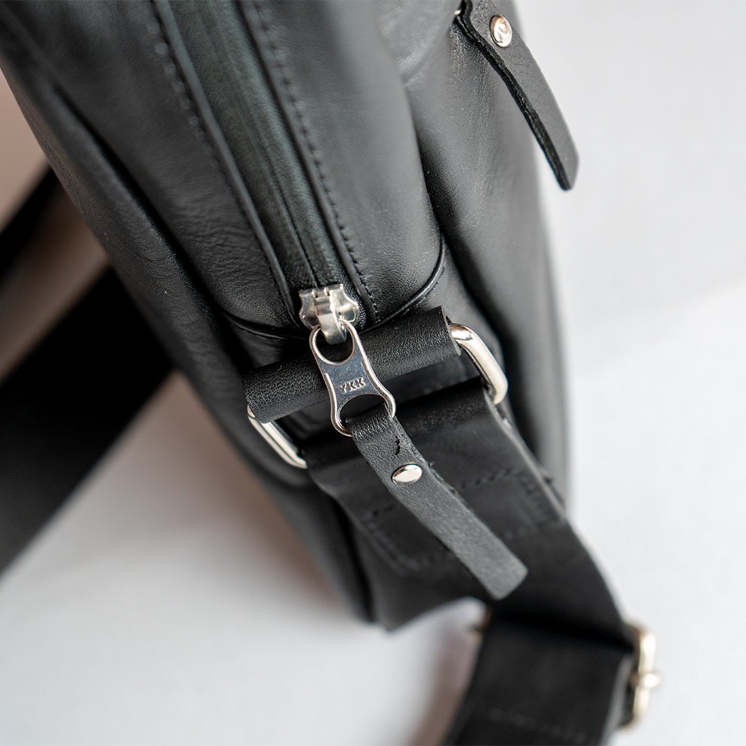 El Morral Basilea confeccionado en cuero vacuno color negro, diseño compacto y correa soft regulable.