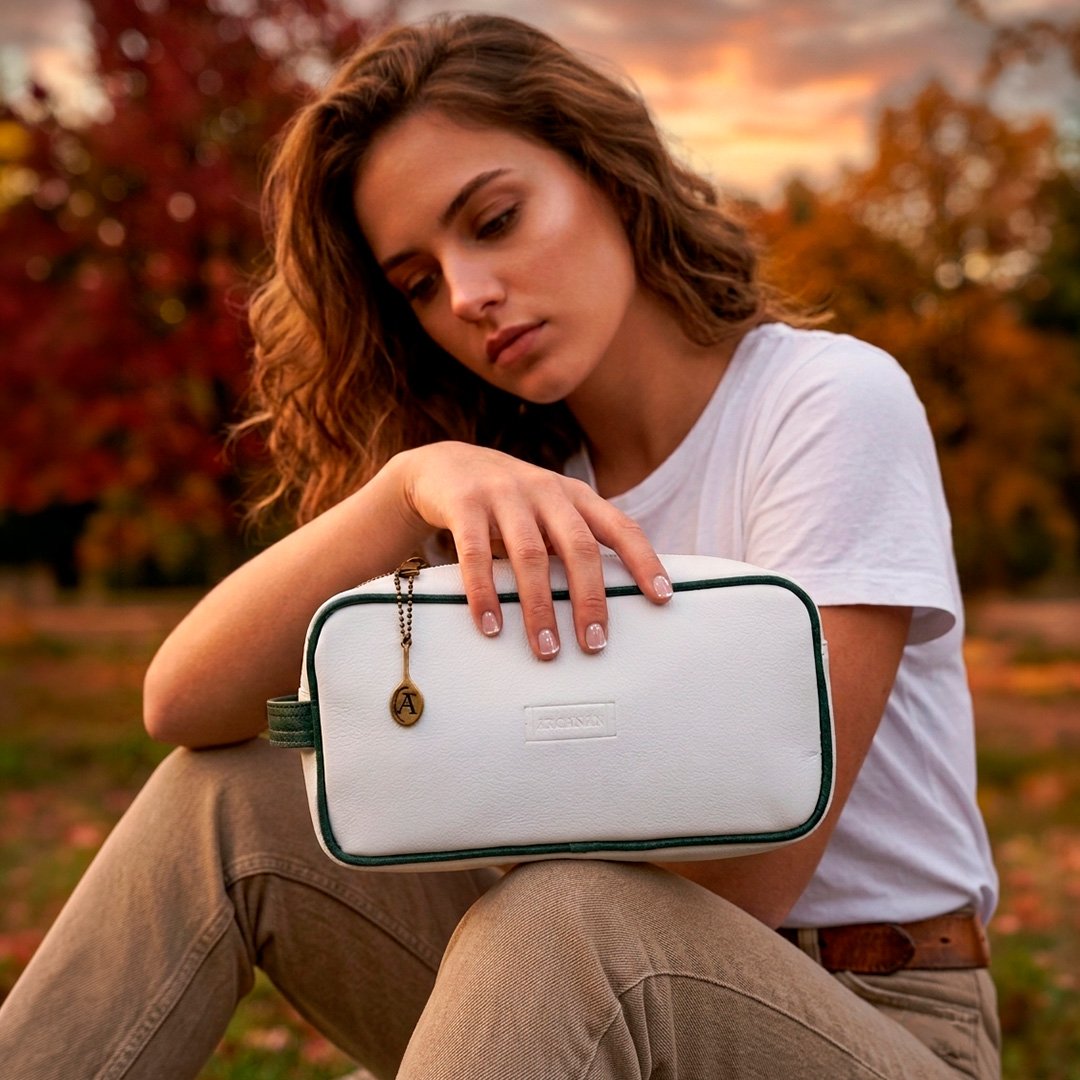 El neceser Lucky Loser, confeccionado en cuero vacuno color Blanco Alpino y Verde Inglés, cuenta con un amplio compartimento interior con bolsillo, forrado en tela gross, para que lleves tus objetos personales en forma organizada. En su exterior incorpora un bolsillo con cierre y tiene manija para transportarlo.
