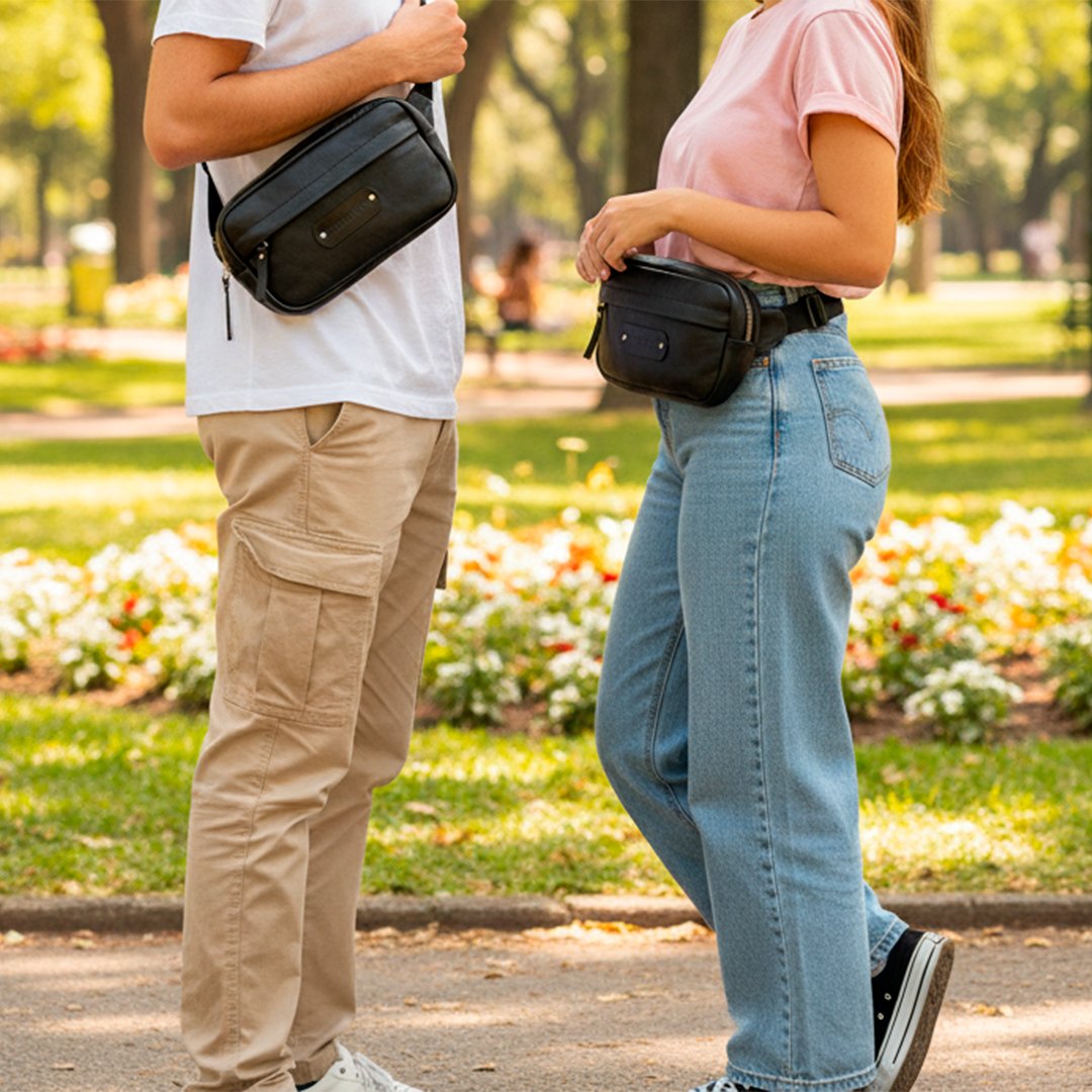 La riñonera Lisboa combina practicidad y elegancia, para llevar todo lo que necesites, tu celular, billetera, lentes, sin problemas. Además cuenta con correa regulable de poliéster y hebilla plástica, que te permiten usarla a la cintura o cruzada. Su diseño interior forrado en tela gabardina con divisorio, y cierre metálico marca YKK te aseguran la durabilidad que buscas, y lo convierten en tu complemento ideal.